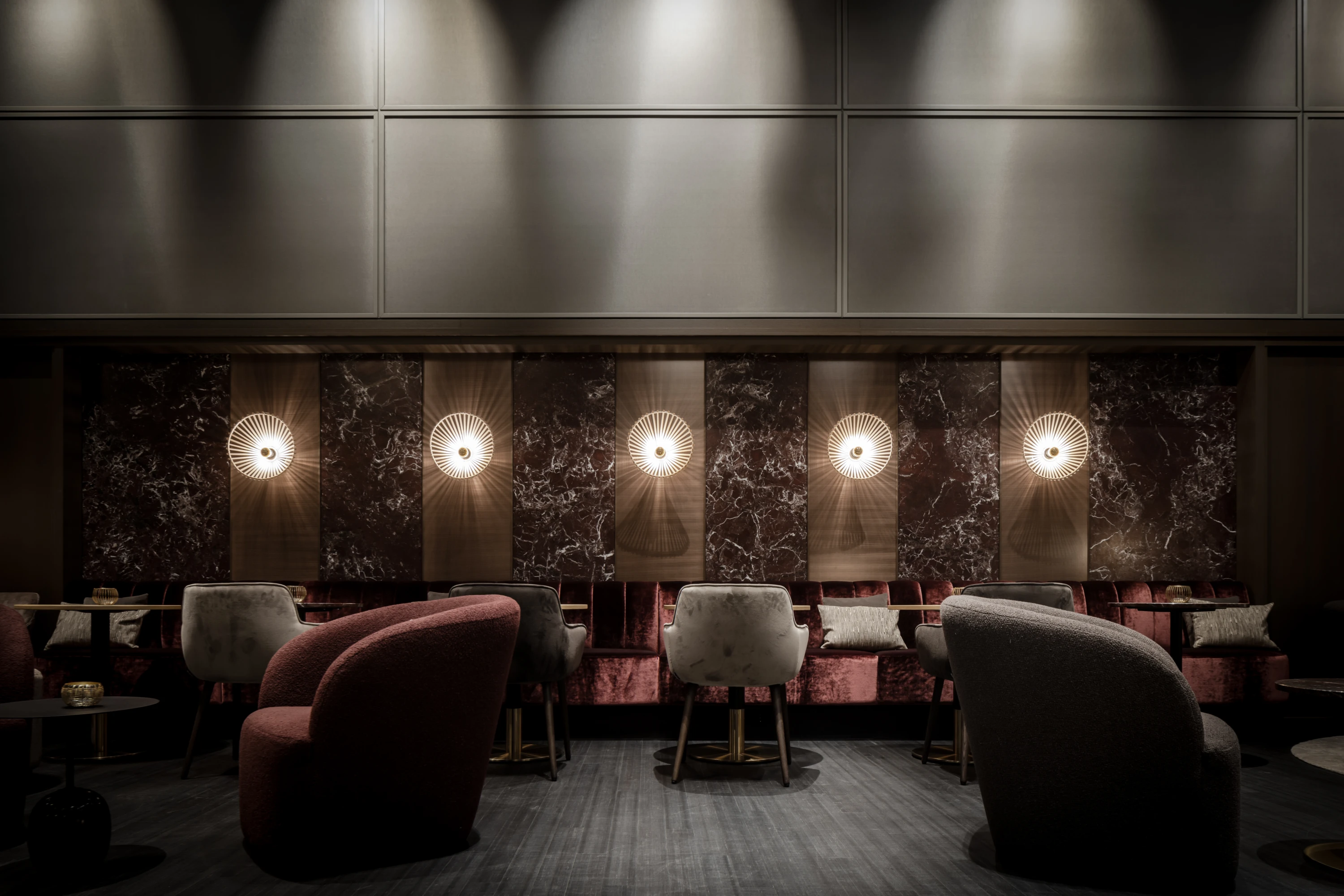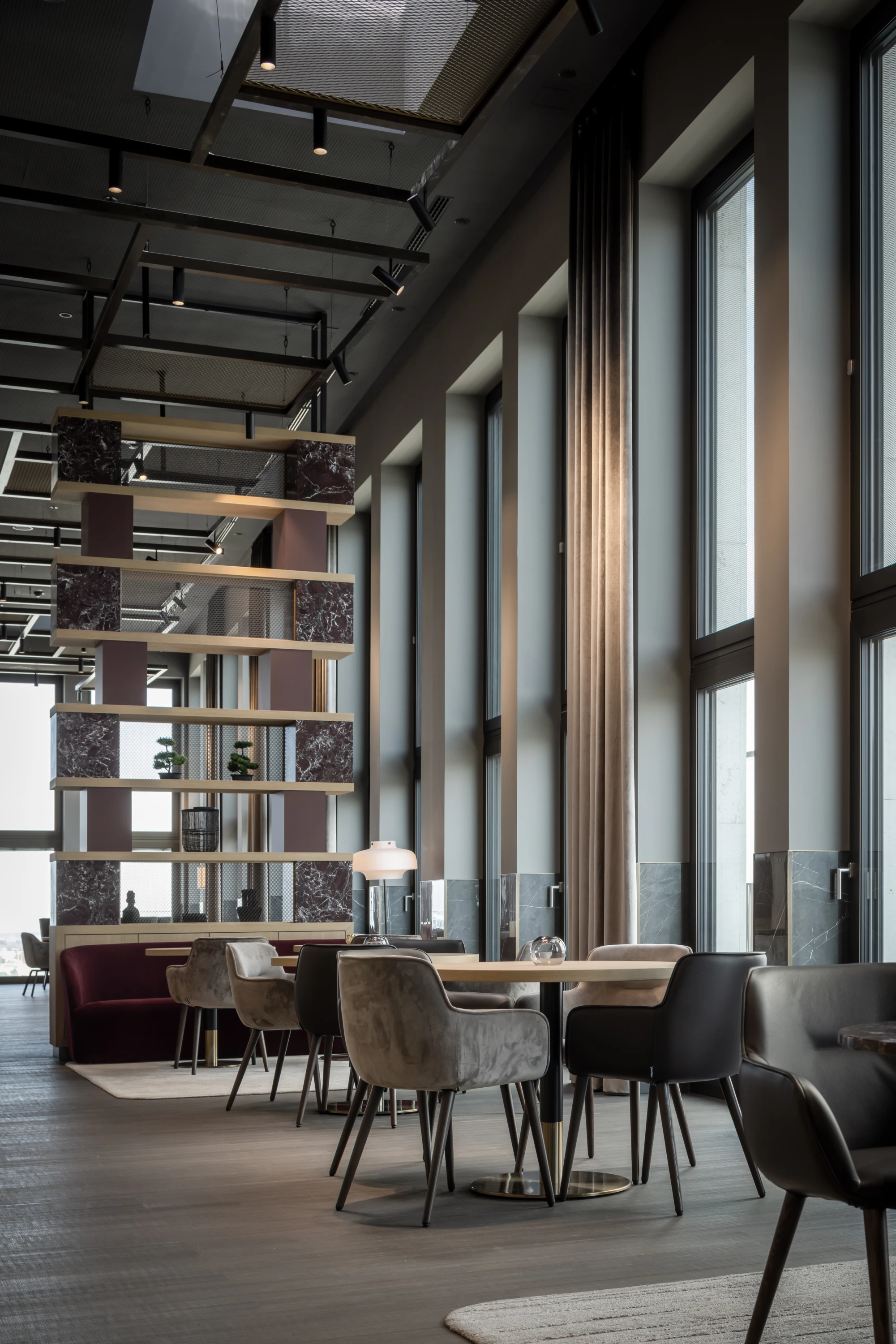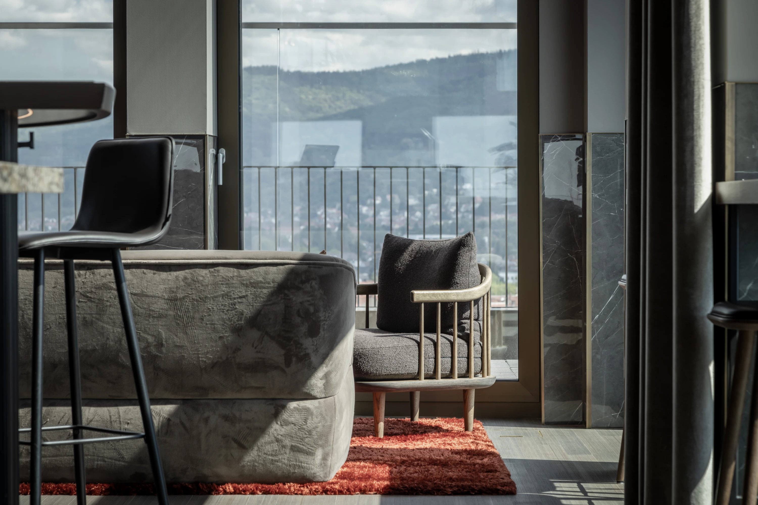 Um die internationalen Gäste adäquat zu beherbergen, haben wir ein kosmopolitisches Design gewählt, das auch in einer großen Metropole seine Berechtigung hätte. Hinzu kommen Aspekte wie Wertigkeit, Komfort und Service, die in einem Vier-Sterne-Superior-Hotel ohnehin selbstverständlich sind. Der Gast soll sich hier wohlfühlen – da kommt es auf die Details an. Etwa, dass die Zimmer mit viel Holz und mit einer eigens gestalteten Wand-Leuchte ausgestattet sind. Akzent-Farben wie Rot und Grün verweisen im gesamten Hotel auf die Umgebung Heidelbergs – auf die Bergstraße mit ihrem bekannten Weinlagen und den roten Sandstein aus dem Neckar-Odenwald-Kreis. Im Seafood Grill-Restaurant mit Bar und Rooftop-Terrasse im 15. Stock kann man in eleganter Lounge-Atmosphäre den Abend ausklingen lassen. Zum Auftakt des Restaurants erwartet die Gäste ein Teesalon mit raumhoch geschichteten Regalen, was an japanische Architektur erinnert. Hier wie auch im Konferenzsaal auf dem 13.Stock bieten bodentiefe Fenster eine spektakuläre Aussicht auf die Stadt samt Umgebung, was wir in der Gestaltung des Interior Designs mit dunklen Wandoberflächen entsprechend hervorgehoben haben. Ein stilisierter Affe, der sich im Gerüst über der Bar wie im Blätterwald des Dschungels zur fünf Meter hohen Decke nach oben hangelt, fungiert als Gruß an die Stadt, wo an der alten Brücke die Original-Skulptur eine Touristenattraktion darstellt.