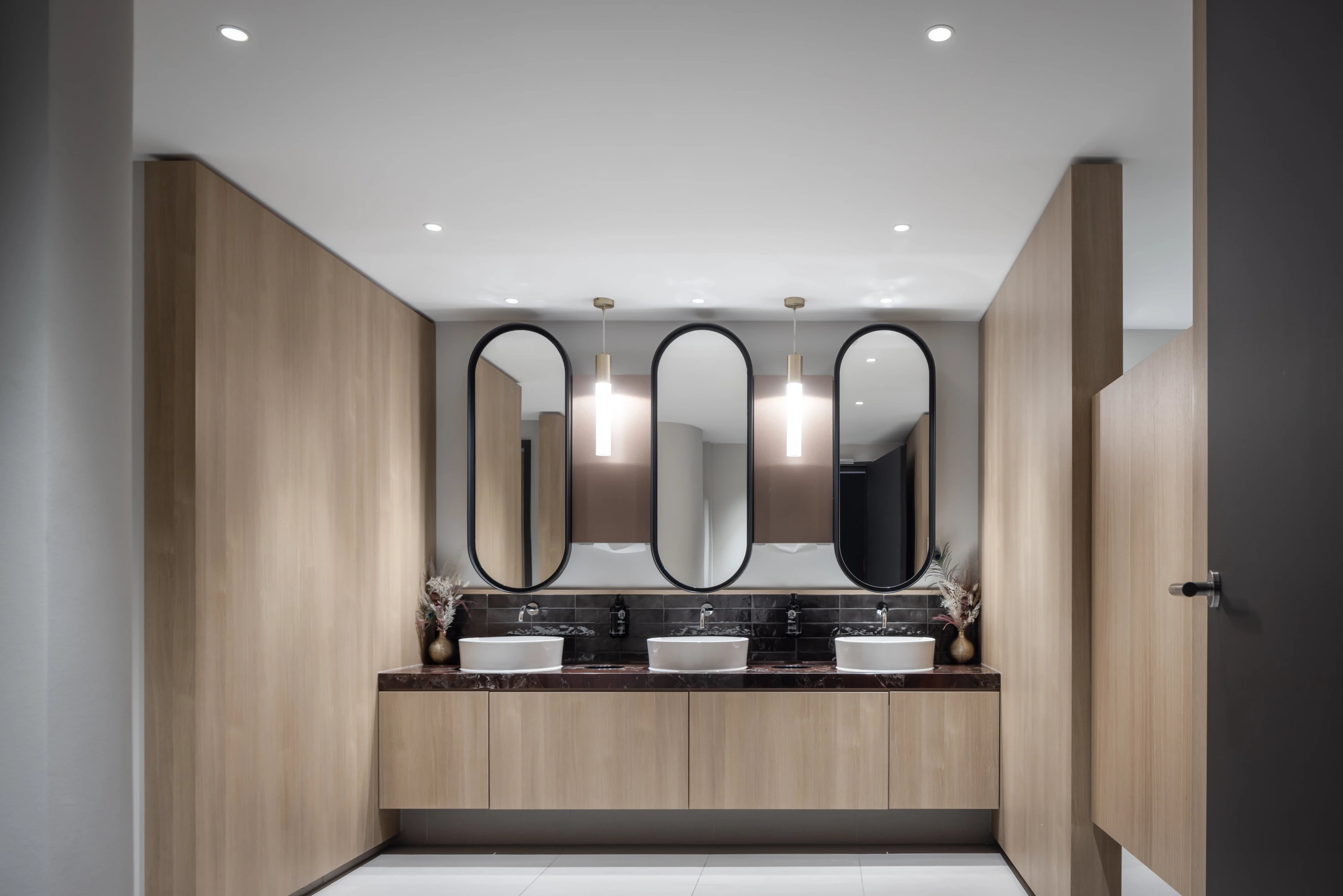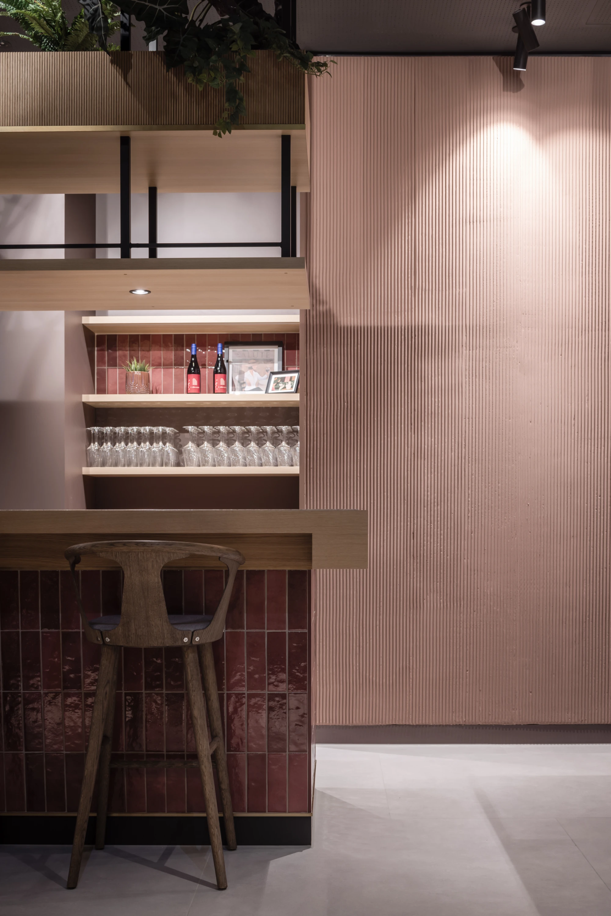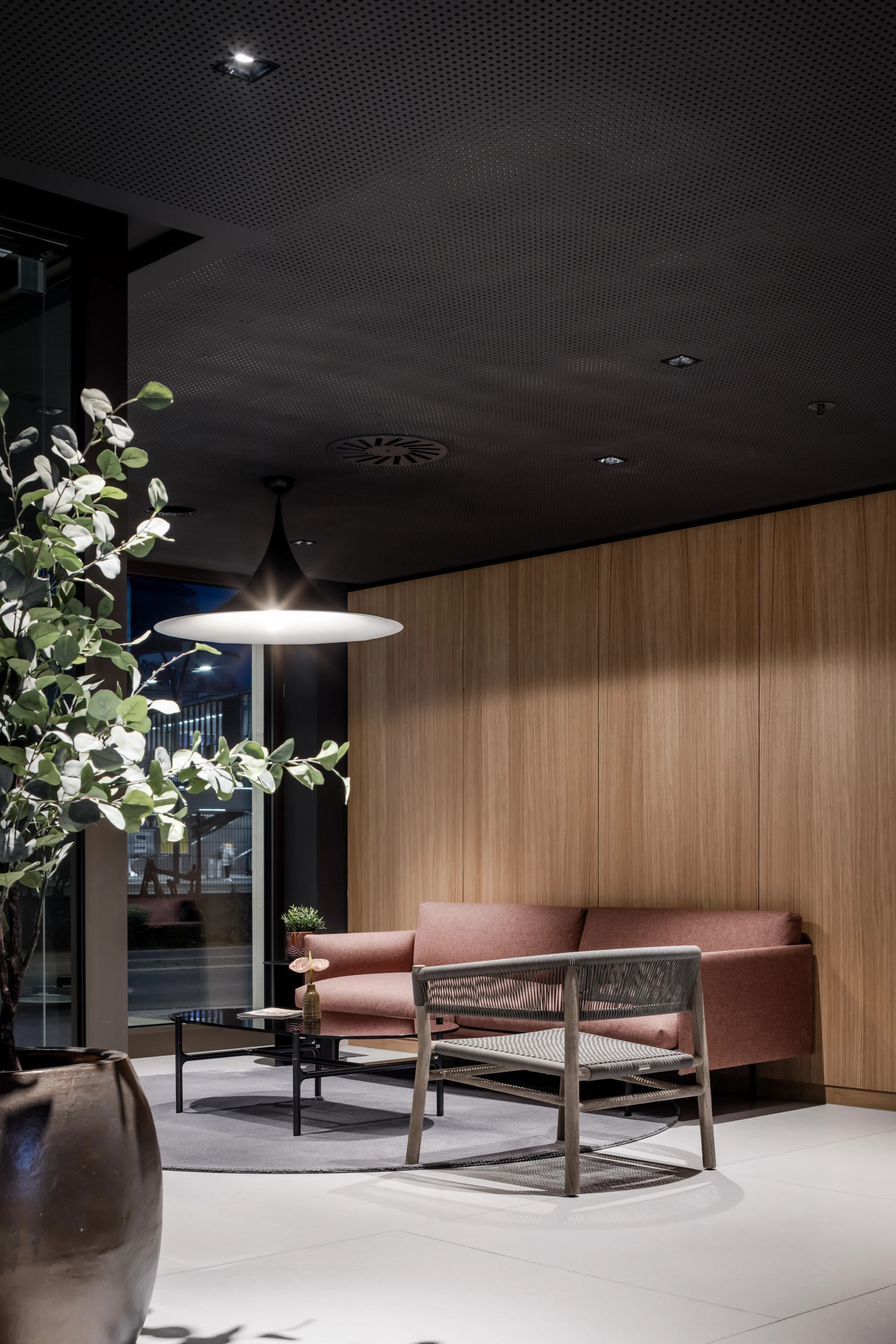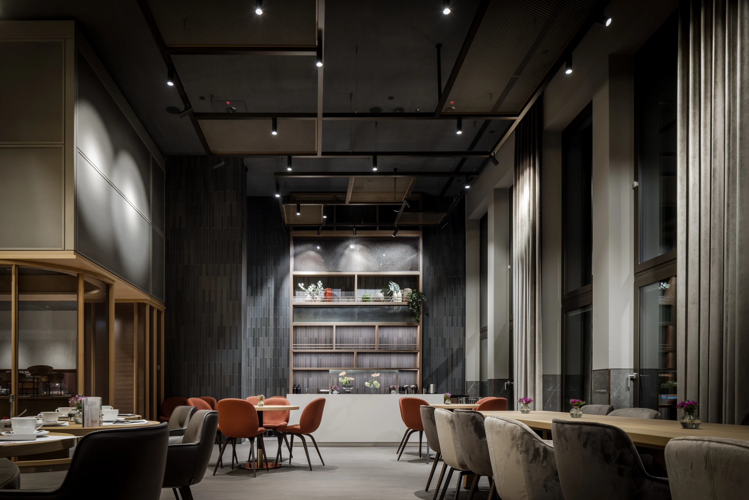 Um die internationalen Gäste adäquat zu beherbergen, haben wir ein kosmopolitisches Design gewählt, das auch in einer großen Metropole seine Berechtigung hätte. Hinzu kommen Aspekte wie Wertigkeit, Komfort und Service, die in einem Vier-Sterne-Superior-Hotel ohnehin selbstverständlich sind. Der Gast soll sich hier wohlfühlen – da kommt es auf die Details an. Etwa, dass die Zimmer mit viel Holz und mit einer eigens gestalteten Wand-Leuchte ausgestattet sind. Akzent-Farben wie Rot und Grün verweisen im gesamten Hotel auf die Umgebung Heidelbergs – auf die Bergstraße mit ihrem bekannten Weinlagen und den roten Sandstein aus dem Neckar-Odenwald-Kreis. Im Seafood Grill-Restaurant mit Bar und Rooftop-Terrasse im 15. Stock kann man in eleganter Lounge-Atmosphäre den Abend ausklingen lassen. Zum Auftakt des Restaurants erwartet die Gäste ein Teesalon mit raumhoch geschichteten Regalen, was an japanische Architektur erinnert. Hier wie auch im Konferenzsaal auf dem 13.Stock bieten bodentiefe Fenster eine spektakuläre Aussicht auf die Stadt samt Umgebung, was wir in der Gestaltung des Interior Designs mit dunklen Wandoberflächen entsprechend hervorgehoben haben. Ein stilisierter Affe, der sich im Gerüst über der Bar wie im Blätterwald des Dschungels zur fünf Meter hohen Decke nach oben hangelt, fungiert als Gruß an die Stadt, wo an der alten Brücke die Original-Skulptur eine Touristenattraktion darstellt.