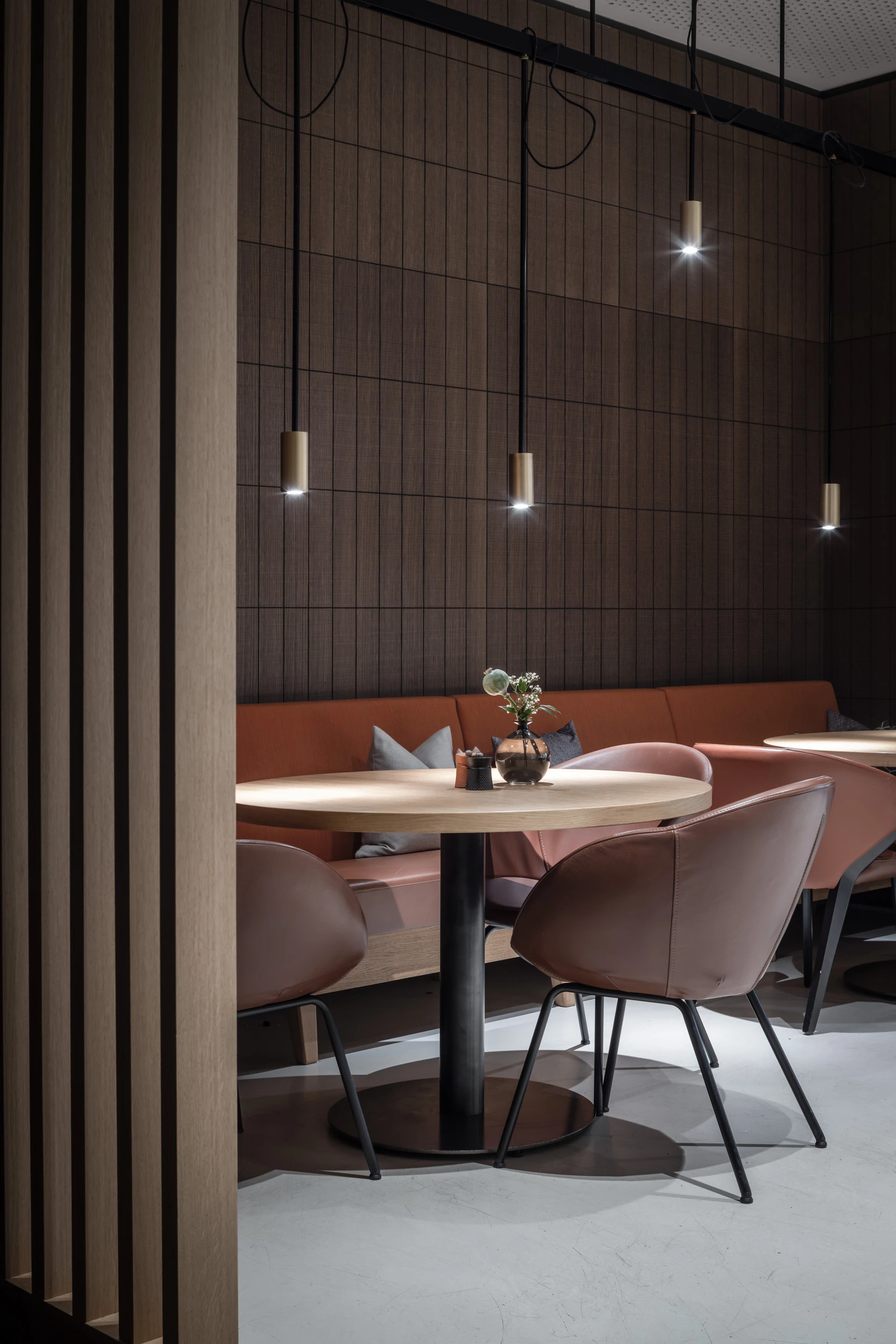 Der Innenausbau ist geprägt von vielen Sonderanfertigungen, vom Grill, über Tresen, Wand- und Deckenelemente bis hin zu Sitzbänken. Hochwertige, natürliche Materialien wie Holz, Stein und Textilien stehen in Kontrast zu industriellen Materialien wie Sichtbeton oder Messing. Eine Wandverkleidung aus Backsteinriemchen im Restaurant spielt auf die historischen Gebäude in Münster an. Bei der Farbgebung haben wir uns von der jahreszeitlichen Verfärbung der Natur inspirieren lassen, die man vom Hotel aus sehen kann. So gibt es Bereiche in frischem Grün als Metapher für Frühling und Sommer sowie in Gelb und Rotbraun für Herbst und Winter. Die Hotelzimmer präsentieren sich stofflich, leicht und modern in der Ausstrahlung.