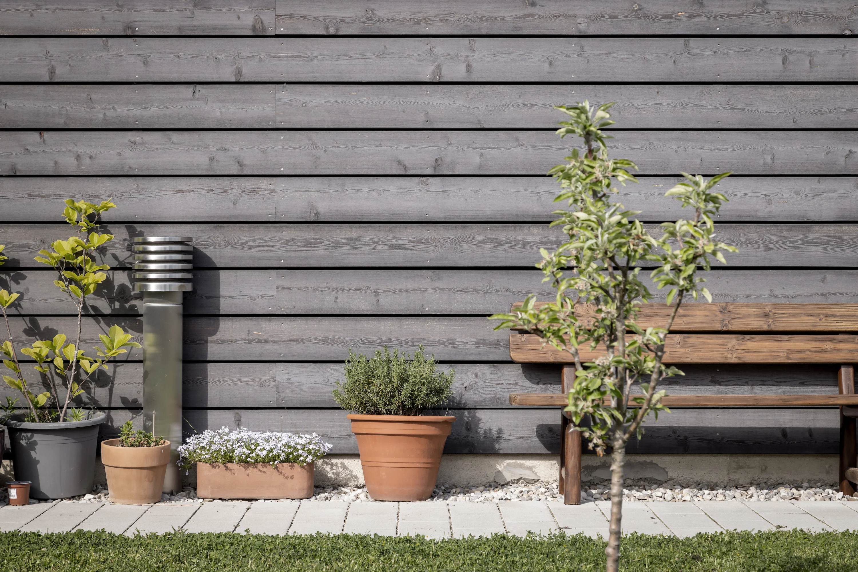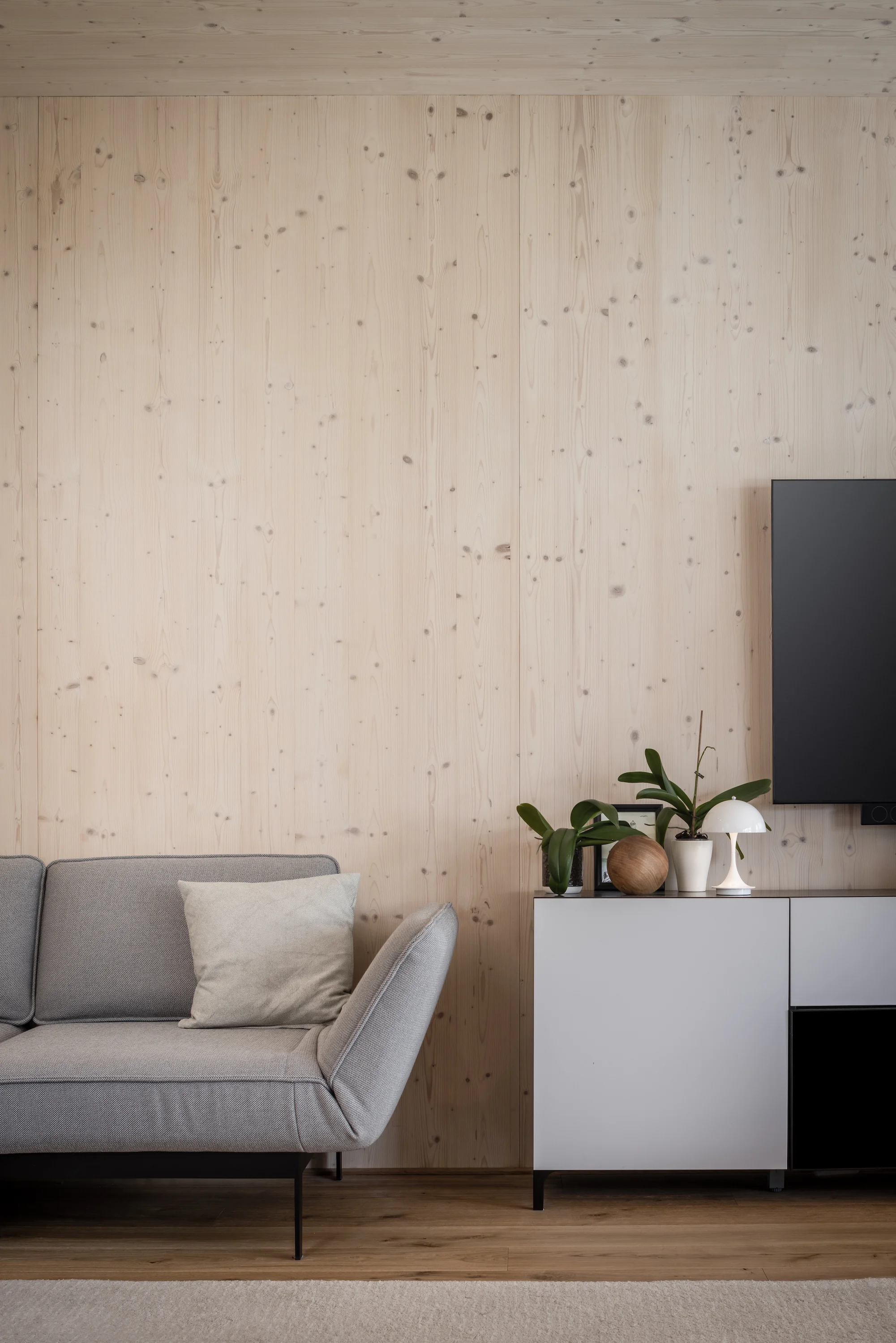 Durch die Massivholzwände aus Brettschichtholz erhält das Haus einen robusten Schallschutz. Den Wandaufbau haben wir gemeinsam mit dem Holzbauer entwickelt: Es kommen neun Zentimeter starke Holzplatten zum Einsatz, auf die zusätzlich eine Dämmung aus Holzwolle sowie die Unterkonstruktion für die Fassade aufgebracht werden. Die Wandelemente wurden fertig montiert – inklusive Haustechnik, Fenstern und Türen – auf die Baustelle geliefert, wo das Haus in nur einer Woche errichtet wurde. Insgesamt dauerten die Bauarbeiten etwa sechs Monate. Dies erforderte eine enge, präzise und gut getaktete Zusammenarbeit mit HBH Holzbau. Die Fassade aus Fichte mit Vorvergrauungslasur wird im Laufe der Zeit durch Verwitterung auf natürliche Weise ergrauen, allerdings mit mehr Unregelmäßigkeiten. Das Spiel aus vertikaler und horizontaler Lattung an den unterschiedlichen Außenfassaden erzeugt eine interessante Spannung.