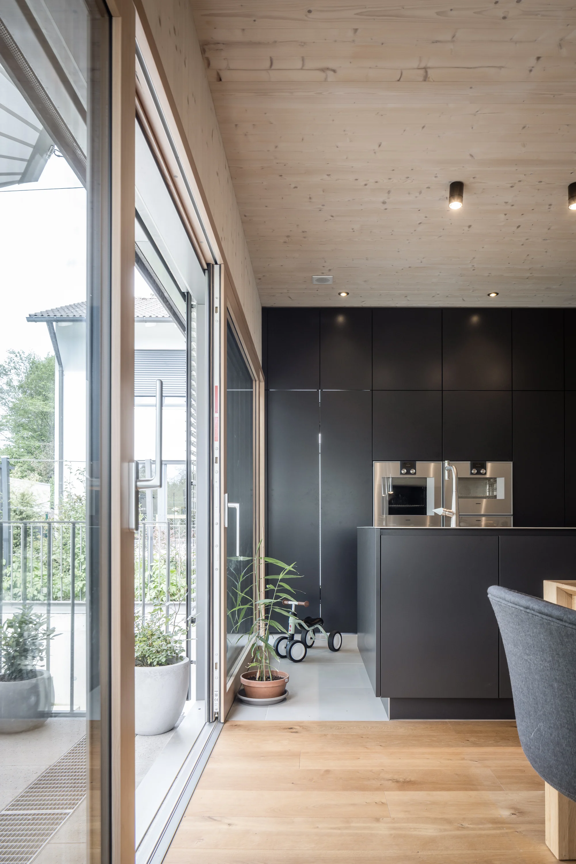 Selbstverständlich und unaufgeregt fügt sich Haus Engel in die Wohnbebauung der beschaulichen Gemeinde Gräfelfing im Landkreis München ein. Das Massivholzhaus, das wir entworfen haben und das HBH Holzbau aus Landau umgesetzt hat, wurde für eine Kleinfamilie gebaut; die Großeltern wohnen direkt nebenan. Die Herausforderung bestand darin, innerhalb dieses kleinen Volumens relativ großzügige Räume zu schaffen. Zwar zeigt sich Haus Engel bescheiden – auch mit seiner Grundfläche von 180 Quadratmetern –, doch durch offene Grundrisse, den freien Treppenaufgang samt Oberlicht und die spezielle Lattenführung an der Fassade entwickelt es eine aparte Ausstrahlung im Detail. Gebaut wurde es für einen bekannten Münchner Koch und seine Partnerin, eine ebenso bekannte Konditorin. Allein deshalb ist die freistehende, von einem Schreiner gefertigte Küche mit High-End-Geräten ausgestattet – was man allerdings nicht sieht, da alles hinter Oberflächen verschwindet. So wirkt das Haus stets aufgeräumt.