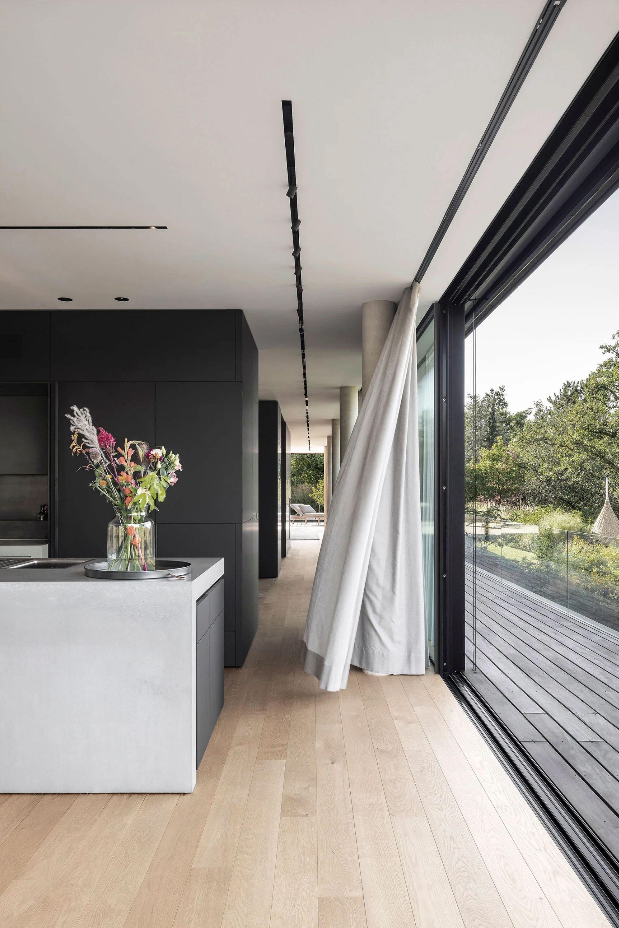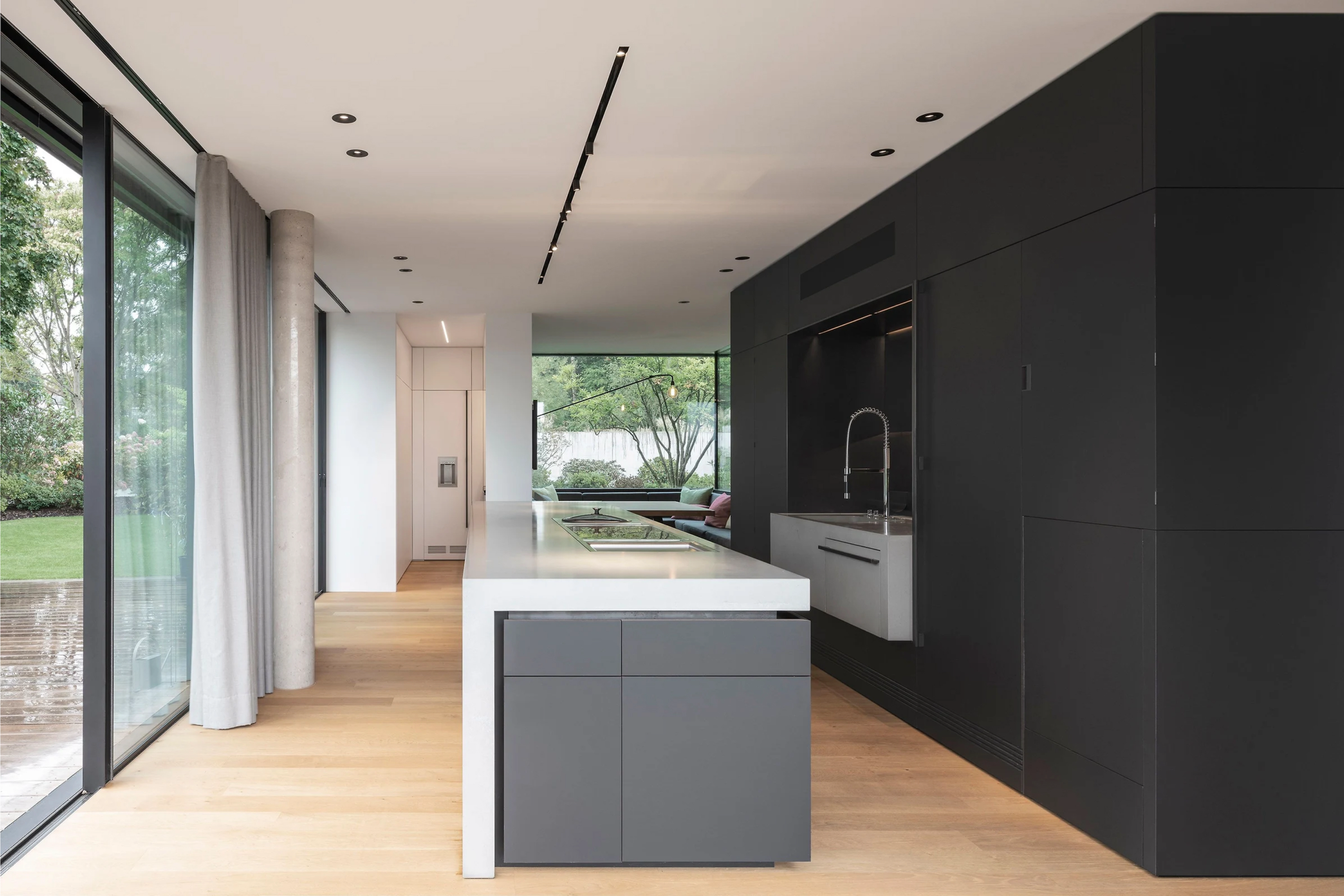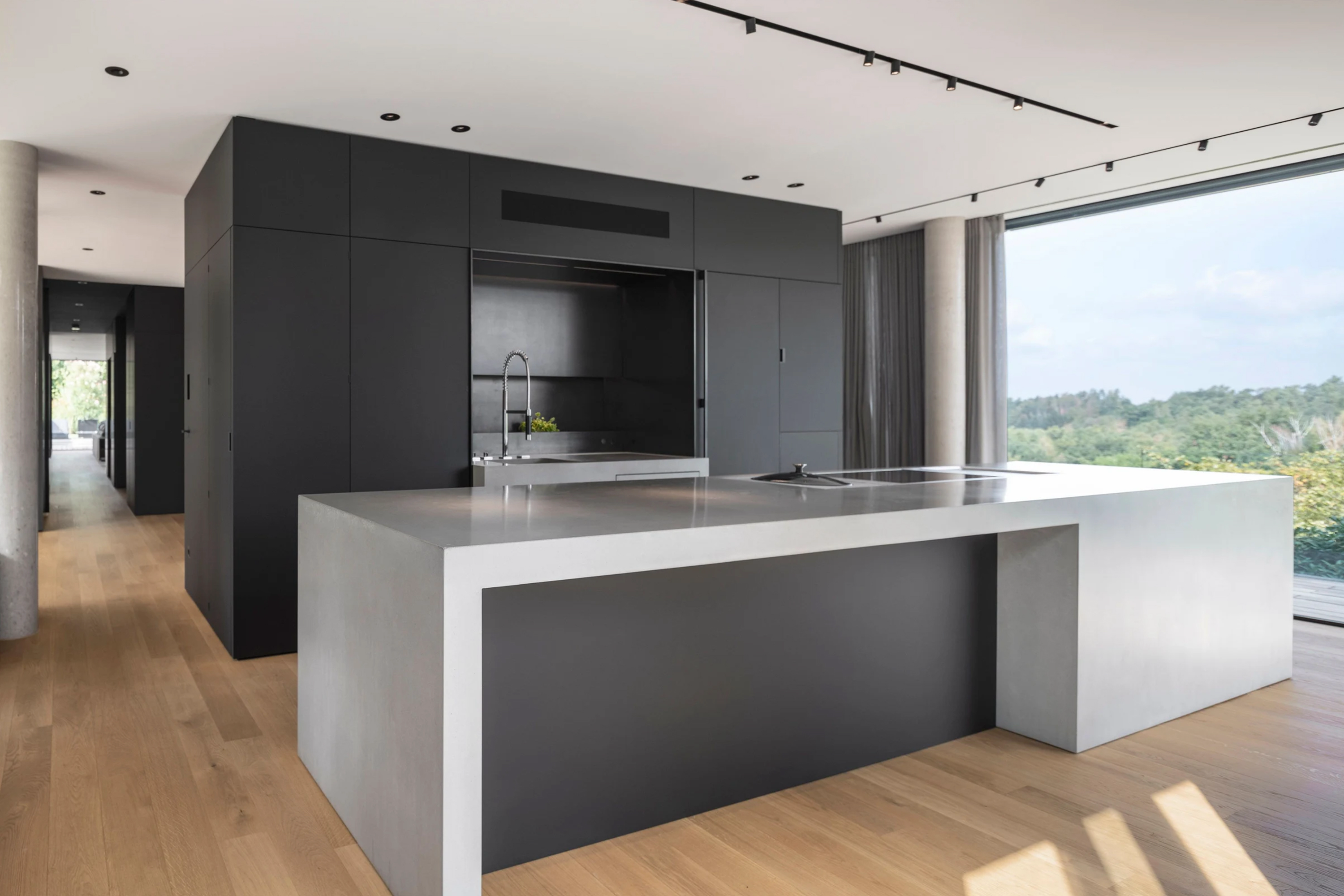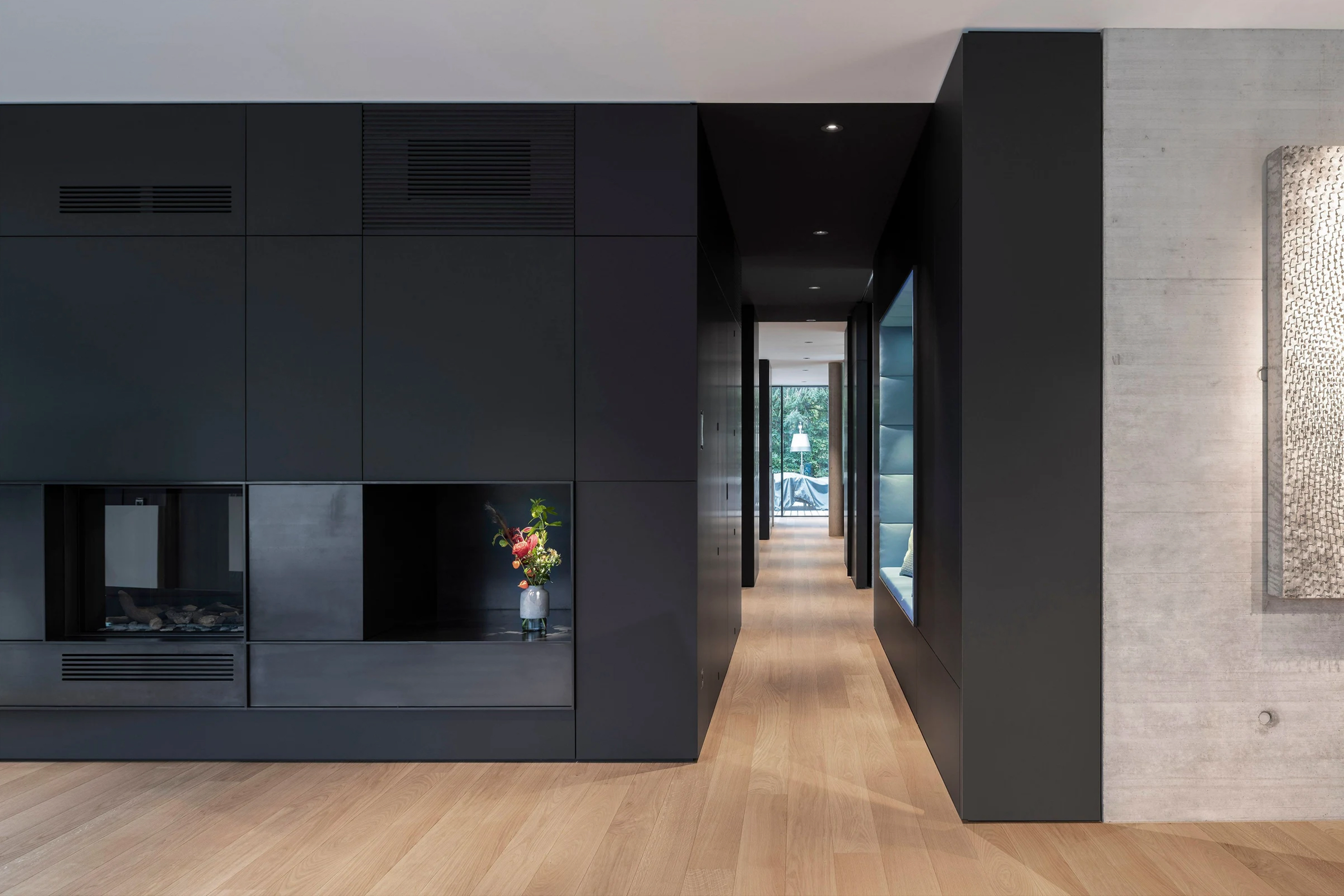 Im Erdgeschoss öffnet sich das Haus über weite Sichtachsen und großzügige Flächen, die das Wohnen mit einer außergewöhnlichen Offenheit und Weite prägen. Drei anthrazitfarbene Kuben strukturieren die offene Wohnebene und integrieren zentrale Funktionen wie Küche, Bar, Garderobe, Gäste-WC und Kamin. Die ruhige äußere Erscheinung der Kuben verbirgt im Inneren eine Vielfalt an Materialien, die den Innenraum der Villa bereichern: Eiche, gelber Onyx, Schwarzstahl, Beton und Mosaikfliesen sorgen für ein hochwertiges, modernes Ambiente. Verantwortlich für den exklusiven Innenausbau war die Holzrausch GmbH, die mit handwerklicher Präzision und gestalterischem Feingefühl ein zeitgemäßes und gleichzeitig warmes Wohngefühl geschaffen hat.