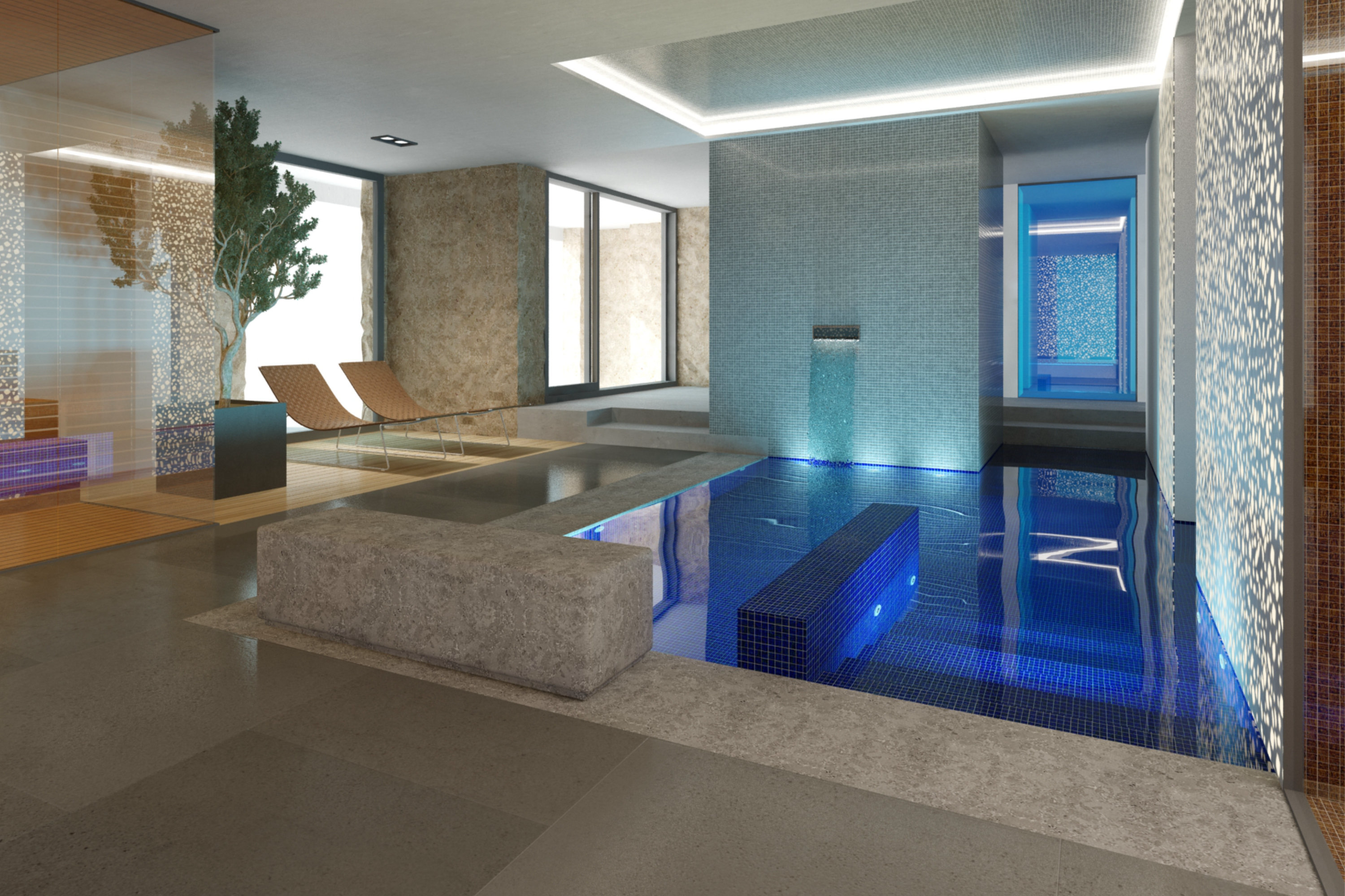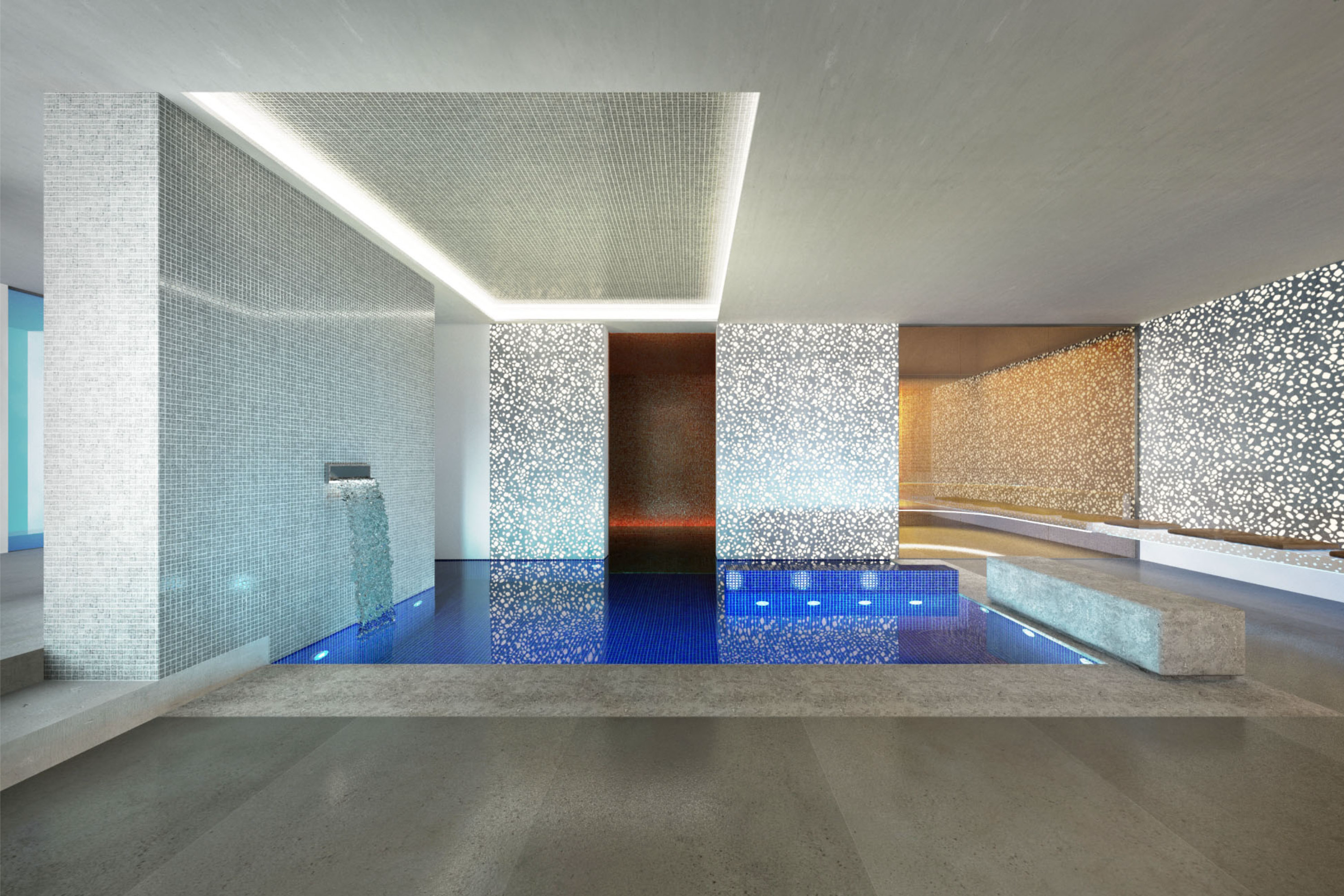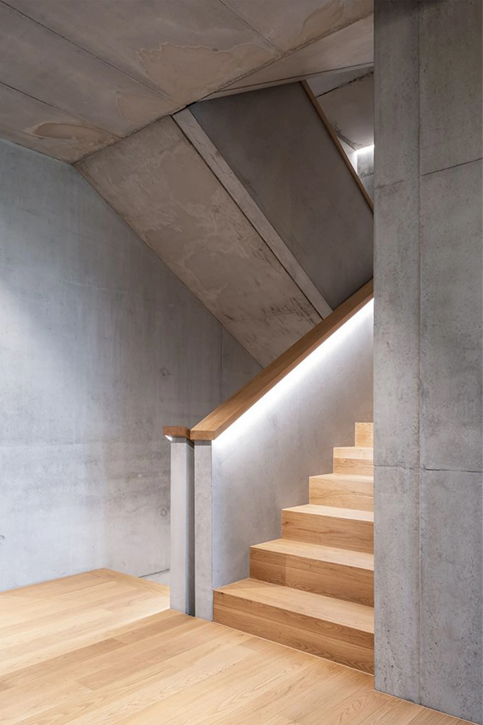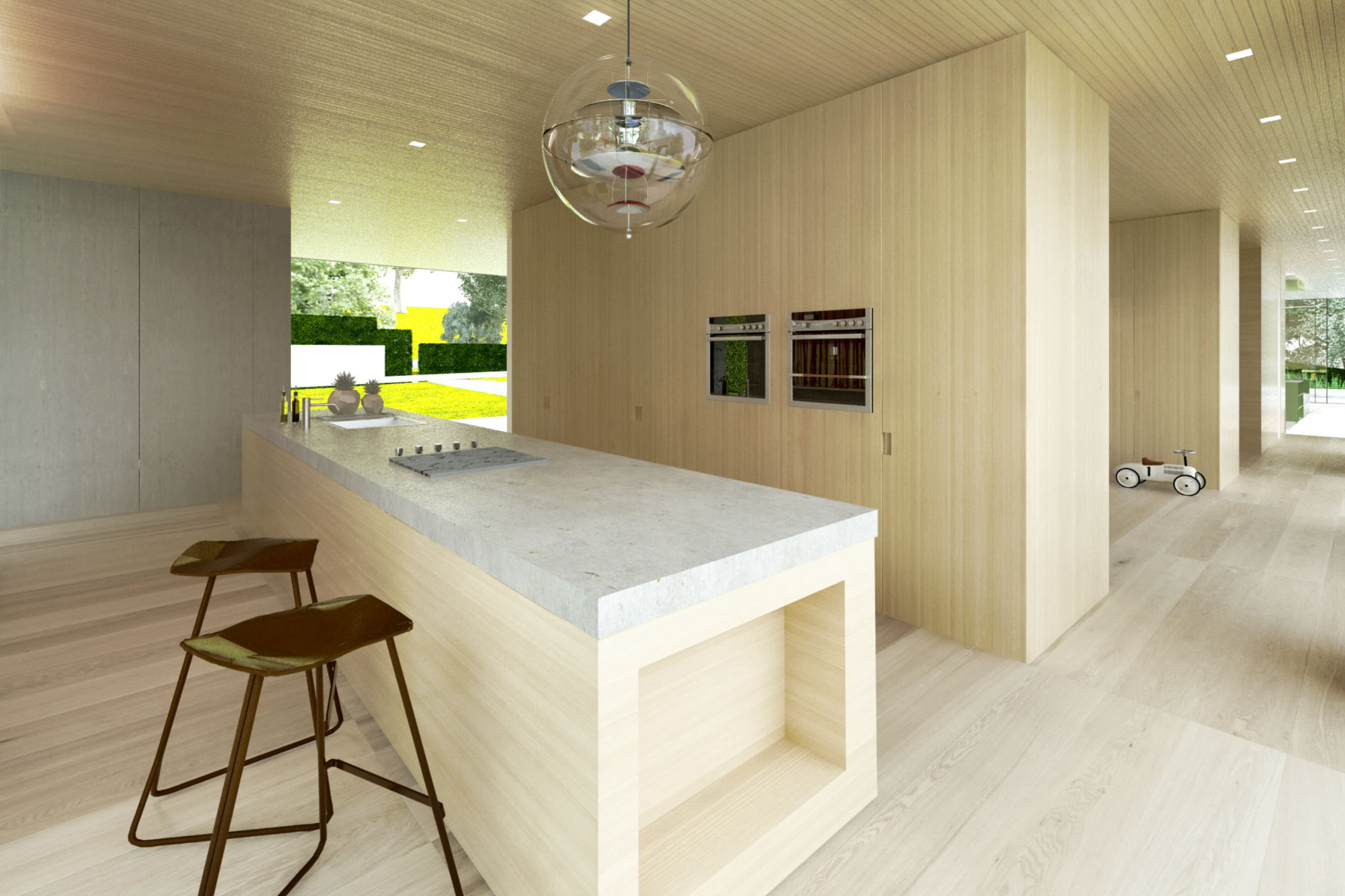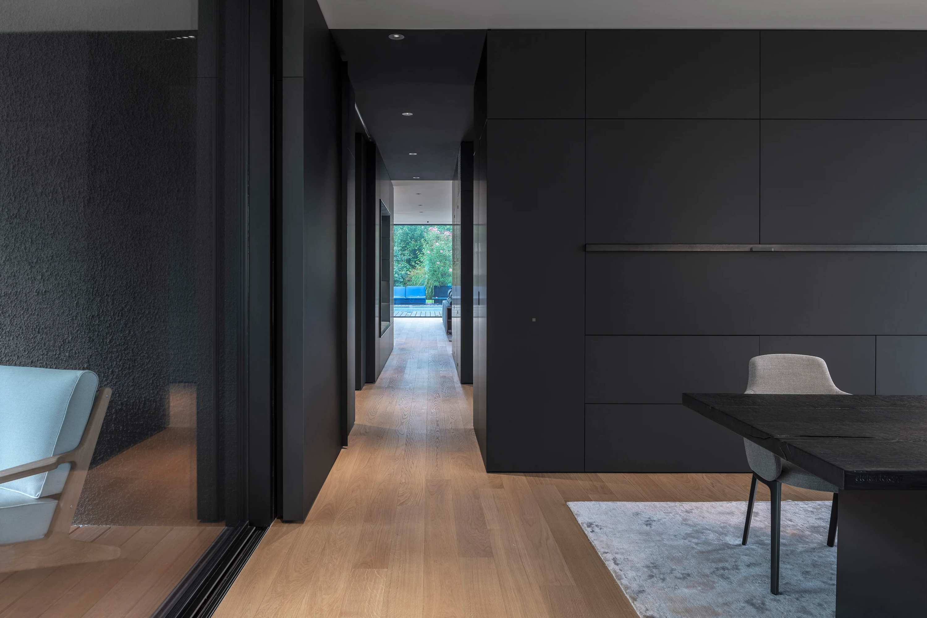 Im Erdgeschoss öffnet sich das Haus über weite Sichtachsen und großzügige Flächen, die das Wohnen mit einer außergewöhnlichen Offenheit und Weite prägen. Drei anthrazitfarbene Kuben strukturieren die offene Wohnebene und integrieren zentrale Funktionen wie Küche, Bar, Garderobe, Gäste-WC und Kamin. Die ruhige äußere Erscheinung der Kuben verbirgt im Inneren eine Vielfalt an Materialien, die den Innenraum der Villa bereichern: Eiche, gelber Onyx, Schwarzstahl, Beton und Mosaikfliesen sorgen für ein hochwertiges, modernes Ambiente. Verantwortlich für den exklusiven Innenausbau war die Holzrausch GmbH, die mit handwerklicher Präzision und gestalterischem Feingefühl ein zeitgemäßes und gleichzeitig warmes Wohngefühl geschaffen hat.